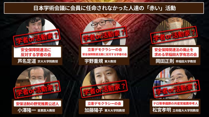 > > 学術界では、国内科学者の代表機関・日本学術会議が1950年、「戦争を目的とする科学の研究には絶対に従わない」とする声明をまとめ、 > > 現在も防衛装備庁の研究助成制度への参加に反対するなど、安全保障分野での研究や開発をタブー視している。 > > > > > > ところが、中国の軍事技術の発展につながる可能性がある共同研究などについては、問題意識が乏しい。 > > > > > > 経済安保に取り組む自民党のルール形成戦略議員連盟の甘利明会長は、「学術会議は軍事研究につながるものは一切させないとしながら、 > > 民間技術を軍事技術に転用していく政策を明確に打ち出している中国と一緒に研究するのは学問の自由だと主張し、政府は干渉するなと言っている。 > > 日本の技術が中国の軍事技術に使われようとしても防ぐ手立てがないのが現状だ」と語る。 > > <a href='https://www.yomiuri.co.jp/economy/20200504-OYT1T50008/'>https://www.yomiuri.co.jp/economy/20200504-OYT1T50008/</a> > > <a href='http://liberty-and-science.org/media1/'>http://liberty-and-science.org/media1/</a> > > > > > > > > 日本学術会議は防衛省予算を使った研究開発には参加を禁じていますが、中国の「外国人研究者ヘッドハンティングプラン」である「千人計画」には積極的に協力しています。 > > <a href='https://amari-akira.com/01_parliament/2020/410.html'>https://amari-akira.com/01_parliament/2020/410.html</a> > > > > > > 他国の研究者を高額な年俸(報道によれば生活費と併せ年収8,000万円!)で招聘し、研究者の経験知識を含めた研究成果を全て吐き出させるプランで > > その外国人研究者の本国のラボまでそっくり再現させているようです。 > > > > そして研究者には千人計画への参加を厳秘にする事を条件付けています。中国はかつての、研究の「軍民共同」から現在の「軍民融合」へと関係を深化させています。 > > > > つまり民間学者の研究は人民解放軍の軍事研究と一体であると云う宣言です。軍事研究には与しないという学術会議の方針は一国二制度なんでしょうか。 > > > > > > 中国「千人計画」参加隠した米ハーバード大教授を起訴…世界トップ研究者を好待遇招聘 > > <a href='https://www.yomiuri.co.jp/science/20200129-OYT1T50130/'>https://www.yomiuri.co.jp/science/20200129-OYT1T50130/</a> > > > > > > 中国による科学者スカウト、豪報告書が暴いた知的財産入手のからくり > > <a href='https://www.newsweekjapan.jp/stories/world/2020/09/post-94366.php'>https://www.newsweekjapan.jp/stories/world/2020/09/post-94366.php</a> > > > 本日一番ワロタ記事。朝日が応援する左寄りの学術会議に手突っ込まれて怒り心頭なのはわかる。だけどこれが学問の自由への侵害と考えるのは > ごく一部の記者と学者と政治家だけなので皆さん騙されなきよう。それにしても菅さんやるな。 > <a href='https://twitter.com/iwaneba/status/1311896054867009538'>https://twitter.com/iwaneba/status/1311896054867009538</a> > > <a href='https://www.asahi.com/articles/DA3S14643323.html'>https://www.asahi.com/articles/DA3S14643323.html</a> > <a href='https://anonymous-post.mobi/archives/3751'>https://anonymous-post.mobi/archives/3751</a> > <a href='https://anonymous-post.mobi/archives/3736'>https://anonymous-post.mobi/archives/3736</a> > > > 日本の科学者でつくり、政府から独立して政策の提言などを行う日本学術会議の会員について、菅総理大臣が任命しなかったのは6人。 > <a href='https://i.imgur.com/PLNm788.jpg'>https://i.imgur.com/PLNm788.jpg</a> > > 研究内容や経歴をまとめました。 > <a href='https://www3.nhk.or.jp/news/html/20201002/k10012645681000.html'>https://www3.nhk.or.jp/news/html/20201002/k10012645681000.html</a> 政治知新 @seijichishin https://mobile.twitter.com/seijichishin/status/1312284382296633344?p=p 野党が大騒ぎの学術会議の会員任命問題。しかし、彼らの経歴を見ると学者なのか活動家なのか非常に疑問が残る点が出てきている。 特別職国家公務員としての立場になる会員については、総理による実質的な任命権は必要不可欠だろう。 https://pbs.twimg.com/media/EjYrr6fU8AIT88X.jpg:small参考:2020年10月03日(土)11時46分26秒